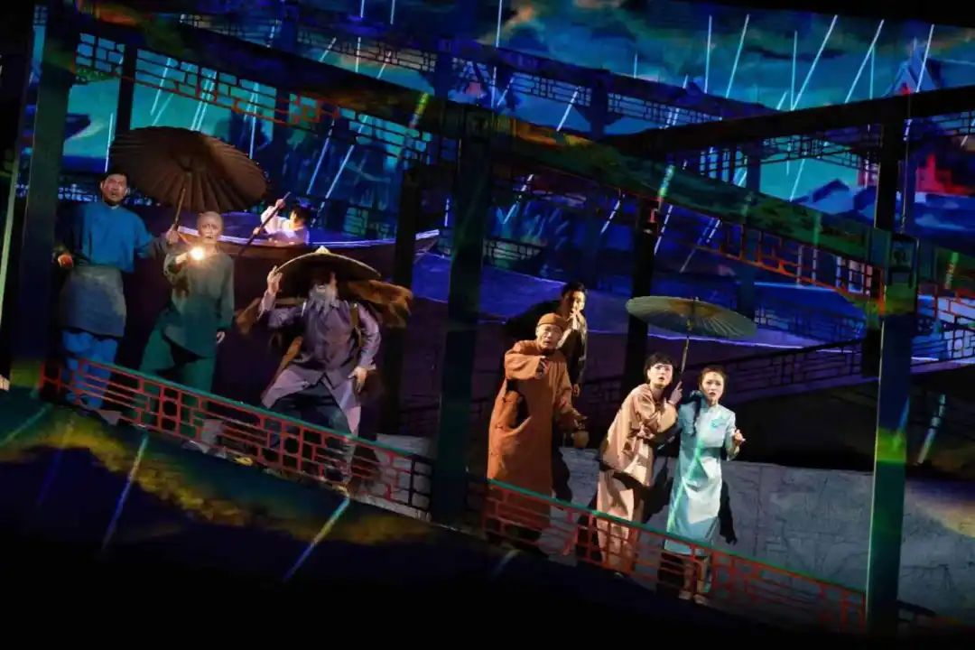 该剧的舞美设置也别出心裁,从服装设置到现场呈现,都采用国内顶级舞美团队倾心打造,在紧扣时代的审美和文化气息的基础上,融合空间交错、弹幕行走,真实与幻影呼应叠加等大胆设计……