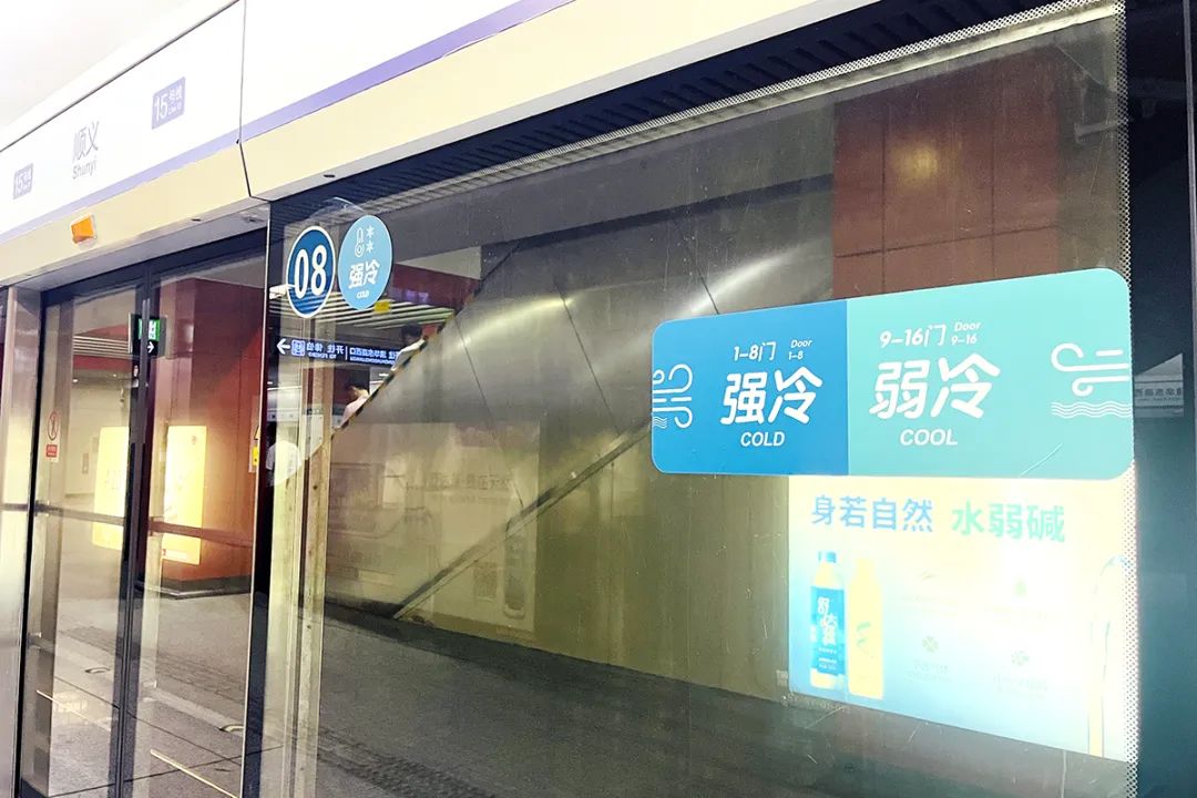 地铁15号线顺义站张贴强冷车厢、弱冷车厢标识。