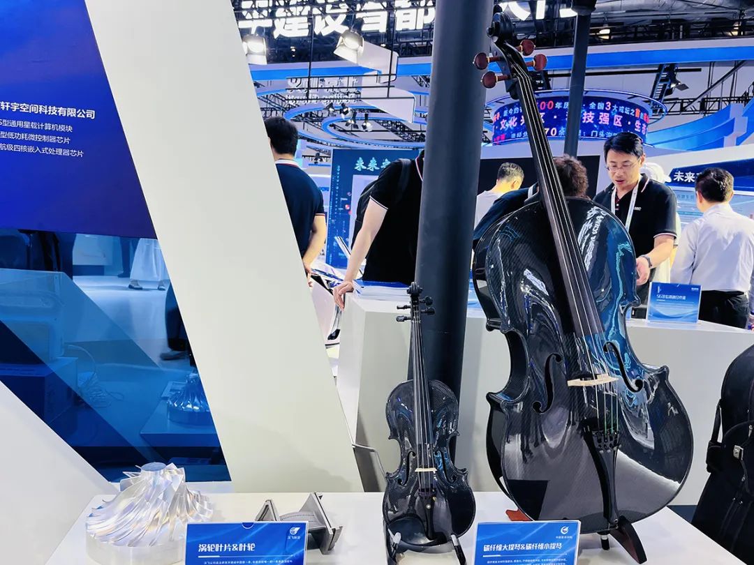 展区中间位置的航空航天板块格外吸睛,展台上放置了一把大提琴和一把小提琴,这是由中航复合材料有限责任公司应用碳纤维复合材料制作而成的。
