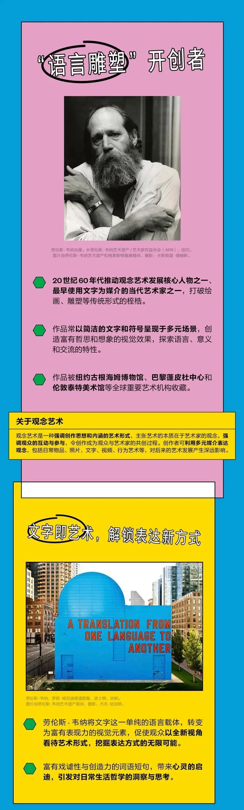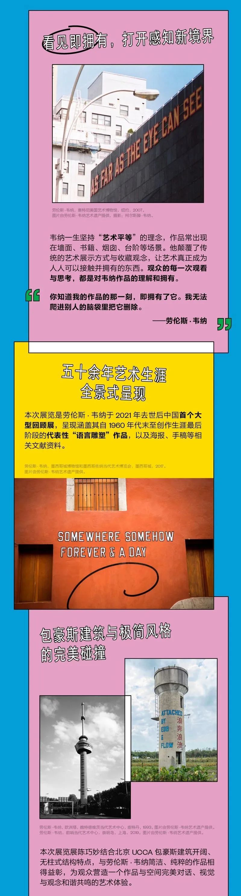 在此次回顾展览中,UCCA与劳伦斯·韦纳艺术遗产合作,呈现了艺术家一系列重要代表作品,包括自20世纪70年代至2010年代的文字作品以及相关文献资料。这是自2007年受UCCA委托创作的个人项目“劳伦斯·韦纳:以邀光”作为UCCA开馆展项目之一展出以来,劳伦斯·韦纳于中国的首个大型机构个展。