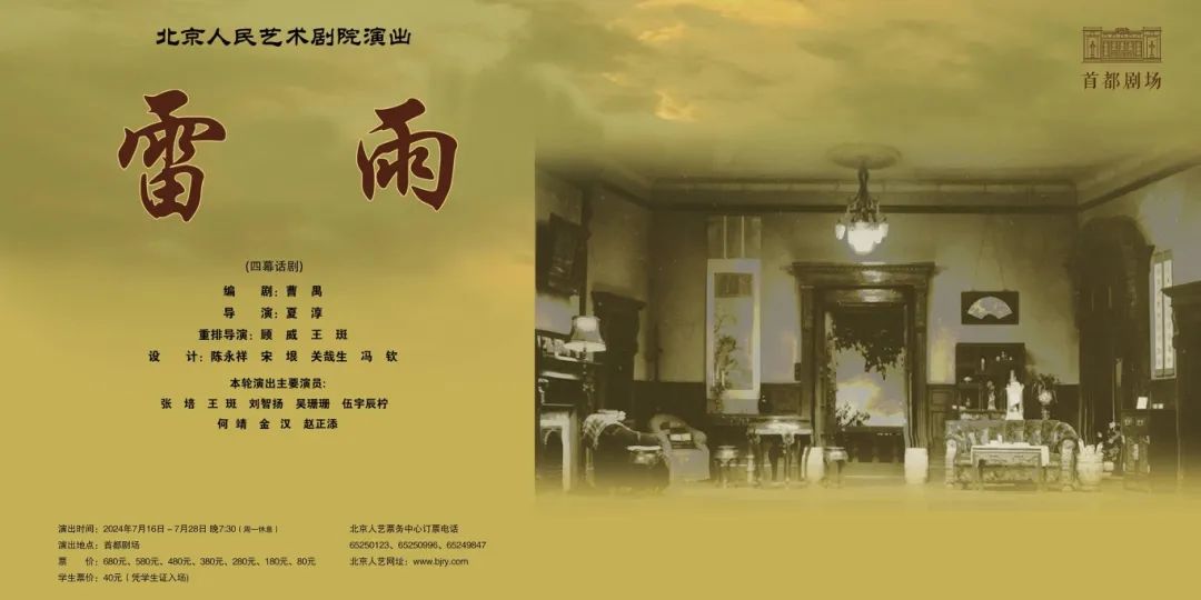 在《雷雨》剧本发表90周年、北京人艺版《雷雨》上演70周年之际,《雷雨》再度登陆首都剧场,开启新一轮演出,邀请观众共同探讨这部中国话剧经典的力量与价值。
