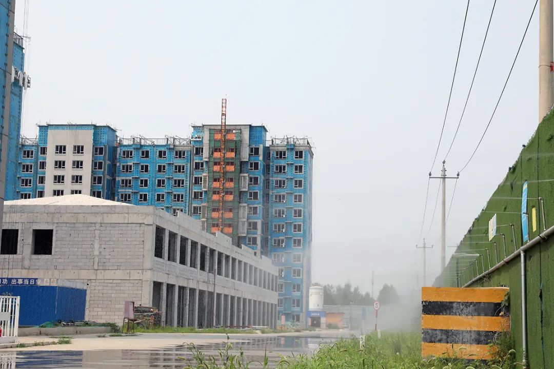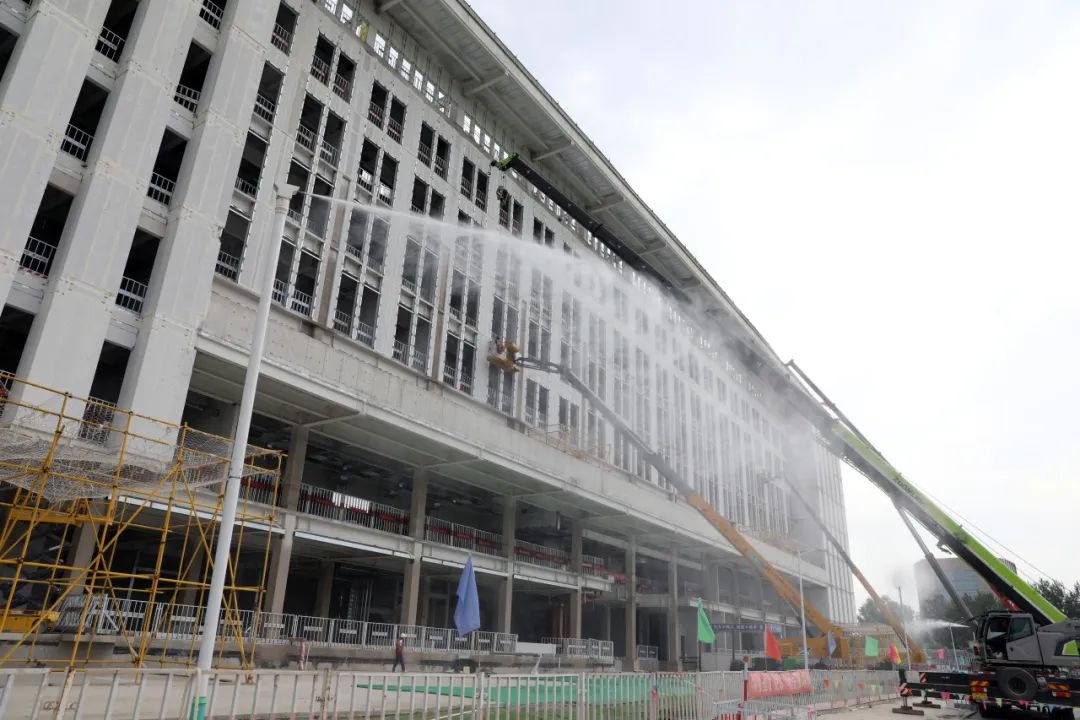 同样获得北京市“绿牌”工地称号的还有顺义区档案馆新馆项目,施工现场,楼体前方正在移动的喷淋设备格外引人注意。这些设备覆盖了整个施工地块,防止施工产生的沙尘向外界扩散。