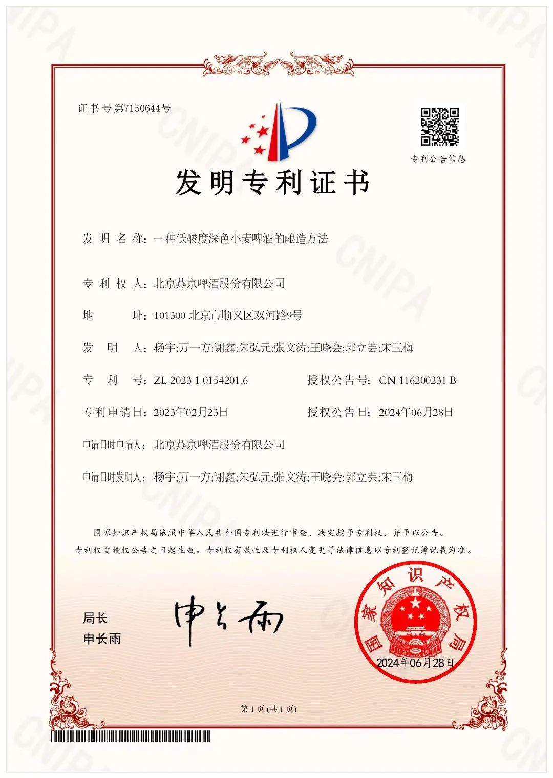 顺义区融媒体中心消息 近日,北京燕京啤酒股份有限公司取得一项名为“一种低酸度深色小麦啤酒的酿造方法”发明专利,有效提高了深色小麦啤酒的适饮性。这一专利技术于2022年开始研发,历时近一年,目前已进行应用转化。