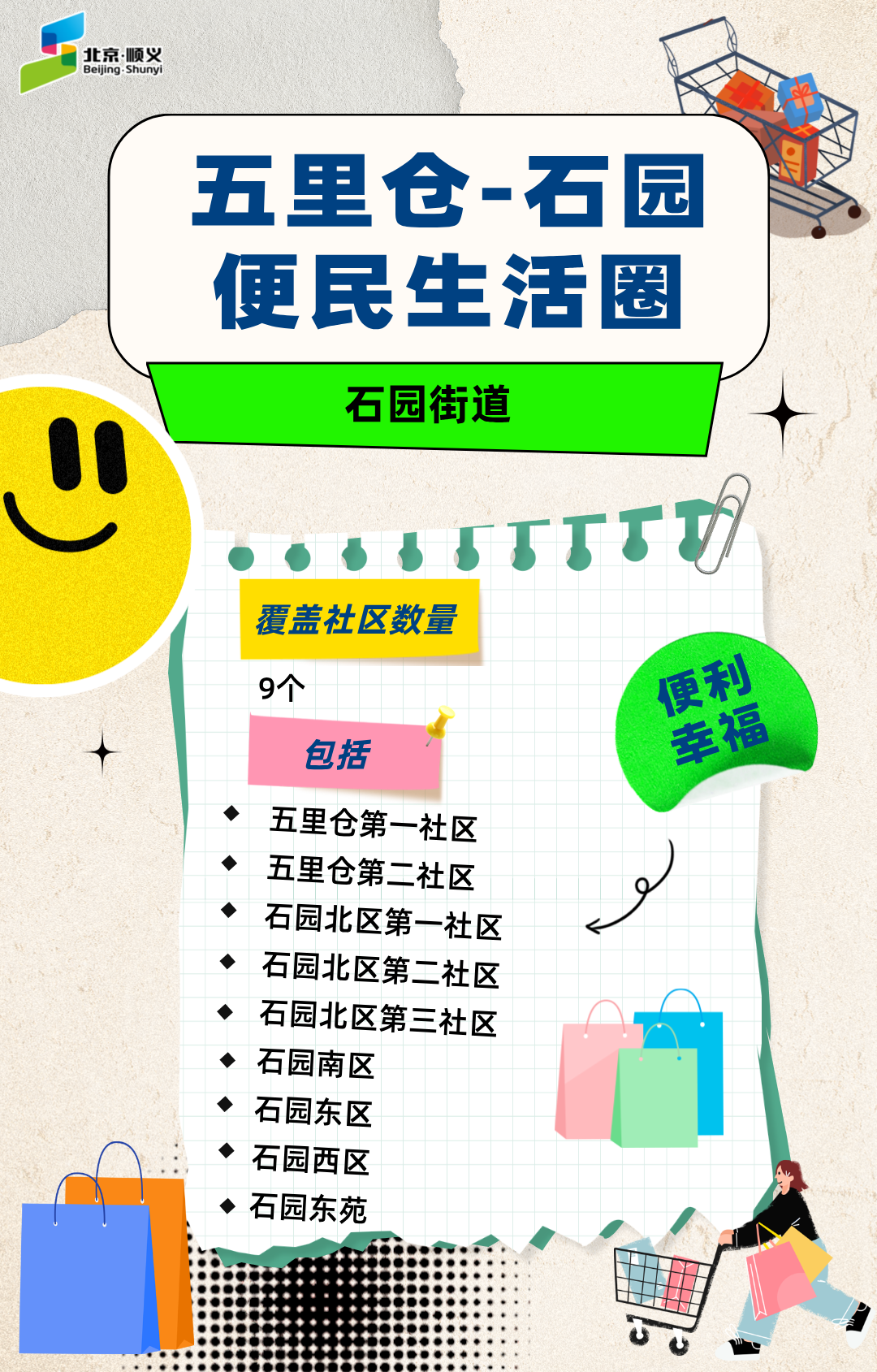 五里仓-石园便民生活圈包含9个社区,面积约1.94平方公里,服务人口约5.2万人,主要以石园大街、石园南大街及石园大卖场“一站式”商业便民服务中心为业态集中区域。生活圈内基本保障类业态与品质提升类业态齐全,为居民提供方便、快捷的生活服务。