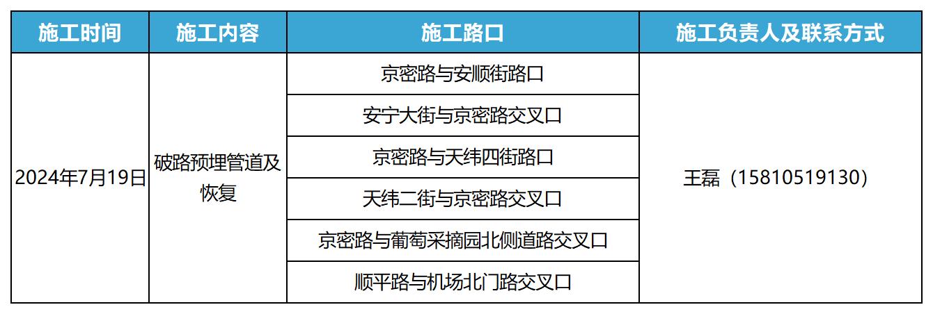 顺义区融媒体中心消息 因“北京市高级别自动驾驶示范区3.0扩区建设项目”施工,7月19日具体施工地点主要涉及:京密路与安顺街路口、安宁大街与京密路交叉口、顺平路与机场北门路交叉口等,如附表所示。为避免拥堵、确保安全,请广大市民提前规划好出行路线。