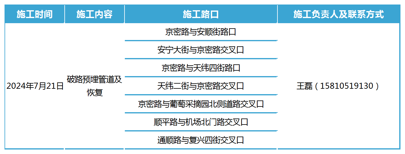 顺义区融媒体中心消息 因“北京市高级别自动驾驶示范区3.0扩区建设项目”施工,7月21日具体施工地点主要涉及:京密路与安顺街路口、安宁大街与京密路交叉口、顺平路与机场北门路交叉口等,如附表所示。为避免拥堵、确保安全,请广大市民提前规划好出行路线。