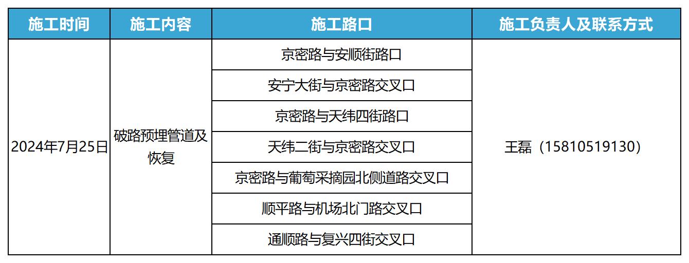 顺义区融媒体中心消息 因“北京市高级别自动驾驶示范区3.0扩区建设项目”施工,7月25日具体施工地点主要涉及:京密路与安顺街路口、安宁大街与京密路交叉口、顺平路与机场北门路交叉口等,如附表所示。为避免拥堵、确保安全,请广大市民提前规划好出行路线。