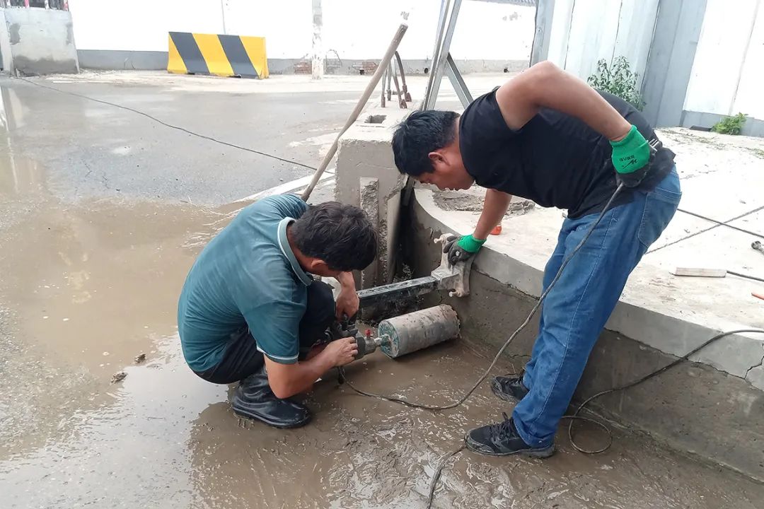 顺建工程公司景盛花园二期项目工作人员连接排水泵,做好项目排水工作。