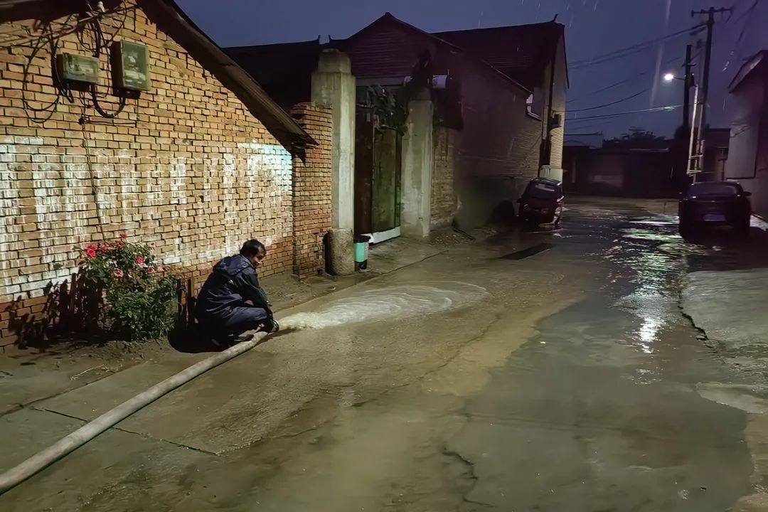 北小营镇大胡营村工作人员为村民排出院内积水。