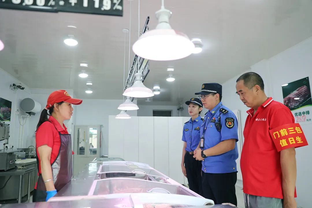 商户自律联盟街长和牛栏山镇工作人员检查商户“门前三包”制度落实情况。