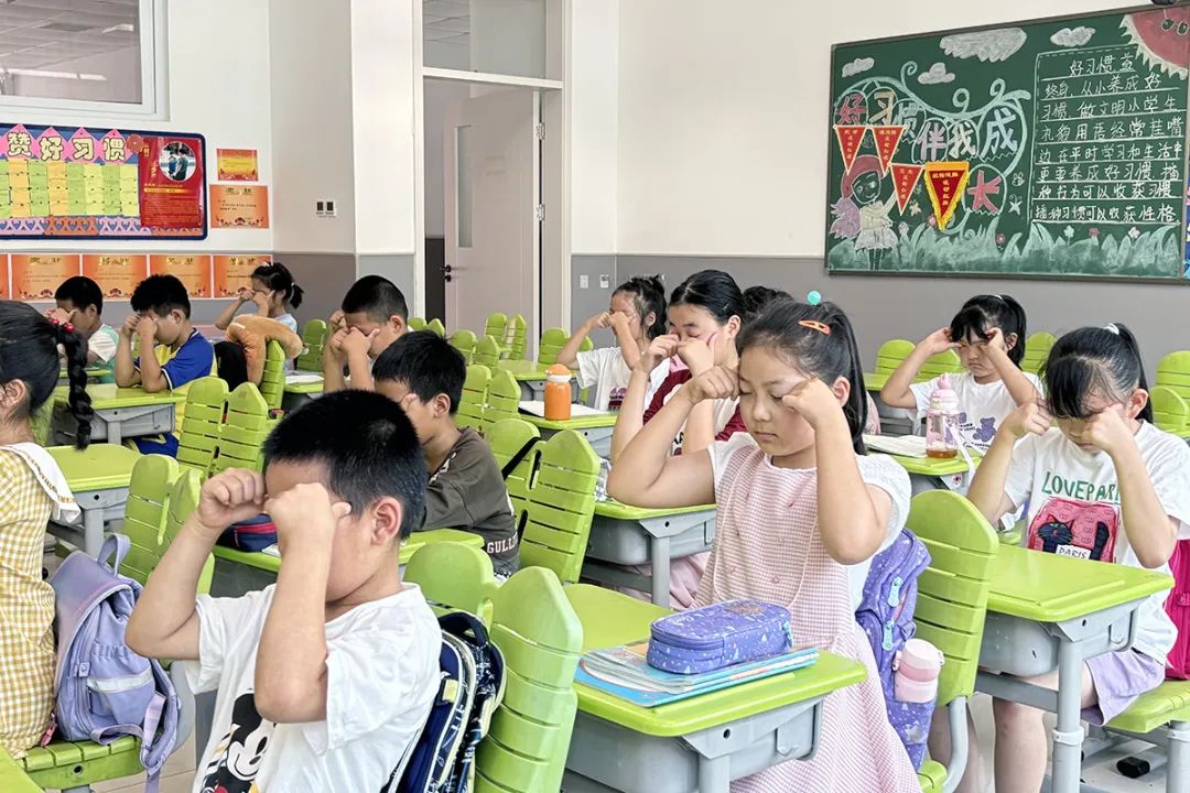 学生们在老师的带领下进行自主阅读、做眼保健操。