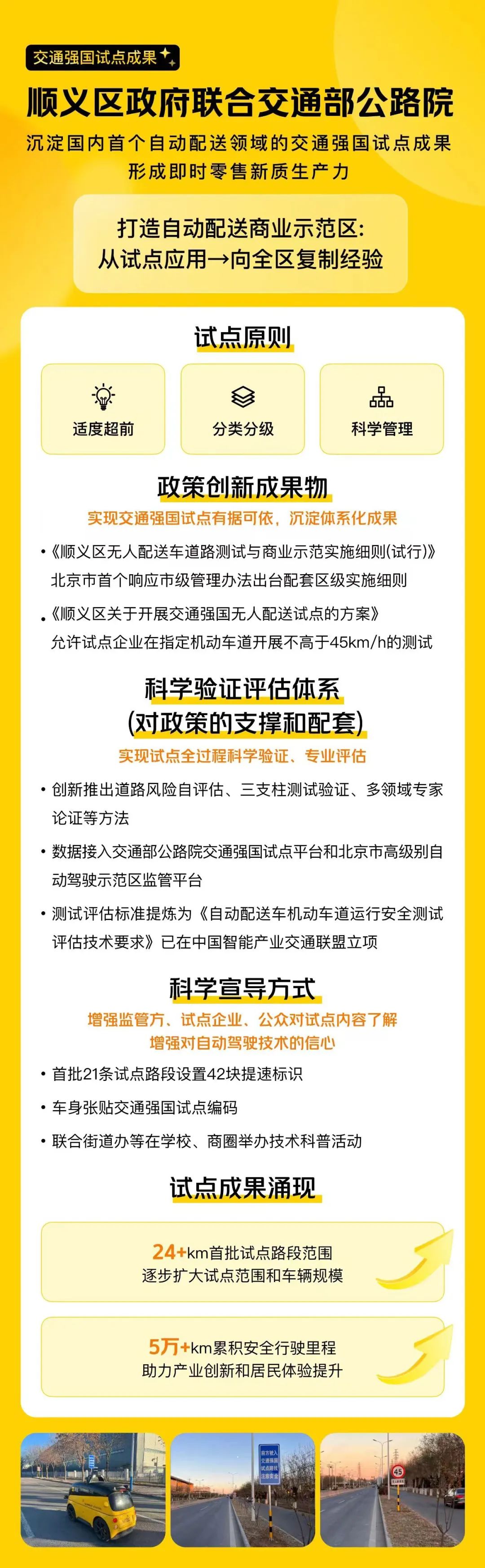 区经信局相关负责人表示,顺义区将依托高级别自动驾驶示范区3.0建设,以扩展试点规模和范围为契机,优先开放更多高商业价值场景和路段,支持更多模式和业态探索,加强对自动驾驶车辆的监督和规范管理,在区域内复制成功经验,打造一个业态多元的自动配送商业示范区,助推北京全球数字经济标杆城市建设。