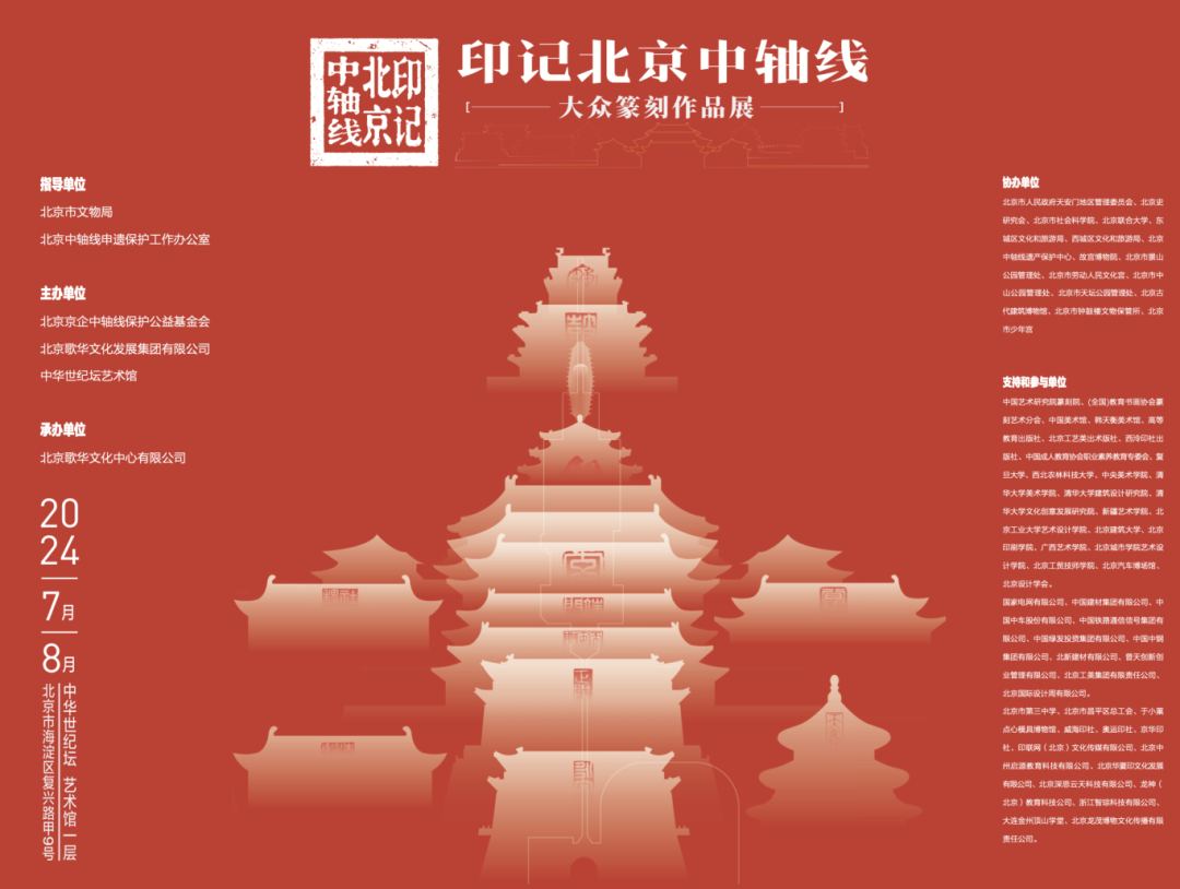 展览以“印记北京中轴线”为主题,通过篆刻这种独特的艺术形式生动展现了北京老城永定门到钟鼓楼15个核心遗产景观、建筑布局和历史文化价值。展览分为序篇、遗产中轴、文脉中轴、活力中轴四个部分。一枚枚精美别致的印章,以小见大、以点带面,让观众在感受大众篆刻艺术无穷魅力的同时,仿佛置身于北京中轴线气势恢宏、秩序井然的空间形态中,近距离体验到了中国传统城市建设中追求天地和谐的文化理念,进一步增强全社会共同保护好北京中轴线历史文化遗产的意识和责任。