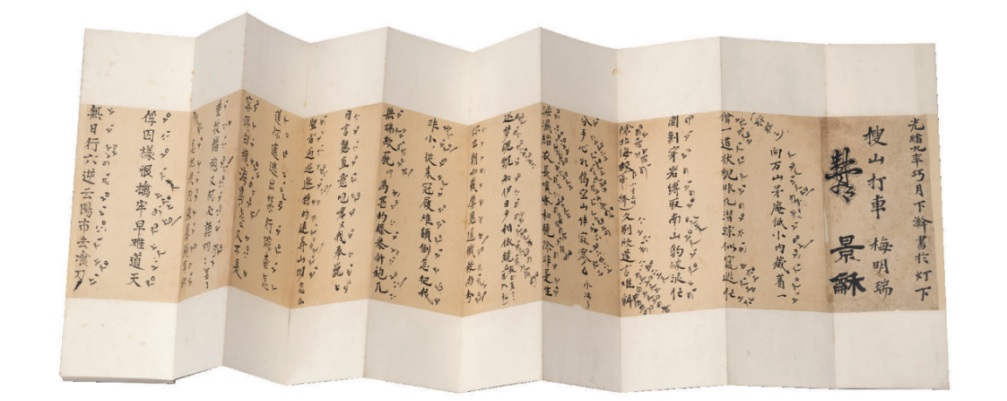 清光绪九年(1883)抄本,经折装,半页二行,有工尺谱。内封题“光绪九年巧月下澣书于灯下”“搜山打车”“梅明瑞”“景和”。该书为梅兰芳父亲梅竹芬手抄京剧传统剧目《搜山打车》演出本。