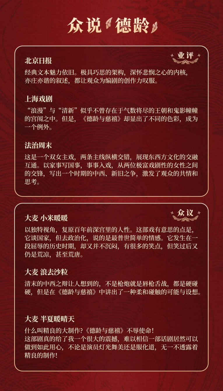 经过全新制作,2019年话剧《德龄与慈禧》在京沪两地再度上演,成为当年众多剧场的“爆款”演出之一,赢得票房和口碑的双丰收。2024年这台传奇故事将在顺义大剧院再次和公众见面。