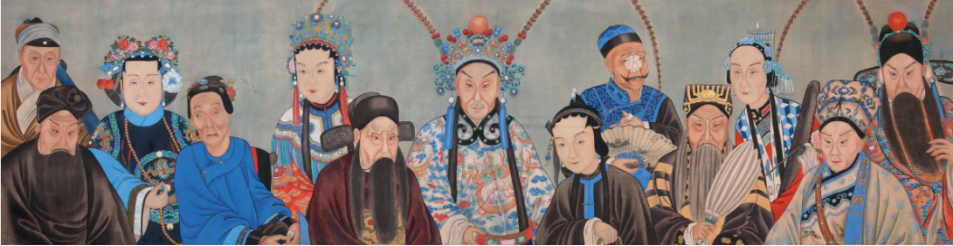 该卷绘制了清代同治、光绪年间十三位著名戏曲演员的戏装扮相,其中左三为《雁门关》萧太后扮相的梅巧玲(梅兰芳祖父)。