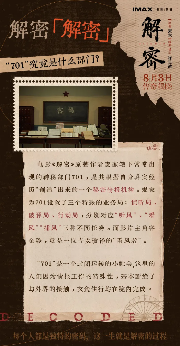 影片根据茅盾文学奖获奖者麦家的同名小说改编,陈思诚编剧并执导,刘昊然、约翰·库萨克领衔主演,陈道明、吴彦祖、俞飞鸿特别出演,任璐遥、陈雨锶、王雨甜、周游、朱珠主演,全程IMAX特制拍摄。电影《解密》将于8月3日全国上映,大银幕见证奇观巨制,震撼视听,不容错过。