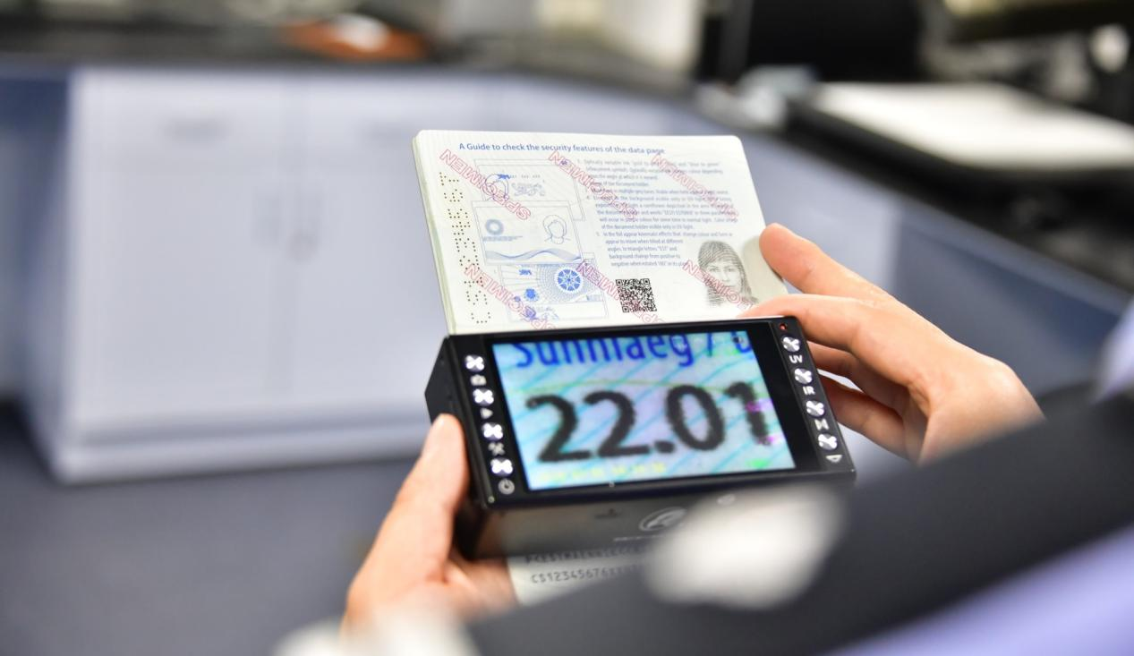 如果说,证件防伪技术是一把“安全锁”,那么证件鉴别设备就是打开这把锁的“钥匙”。以前,一线工作人员使用最为广泛的单兵便携式鉴别设备由国外购置,价格昂贵,功能单一,无法满足定制化需求。2018年,证件研究室团队研发出的“便携式电子多光谱文检仪”,功能更强,使用方便,取得了国家实用新型专利,打破了国外在此类设备上的技术垄断。