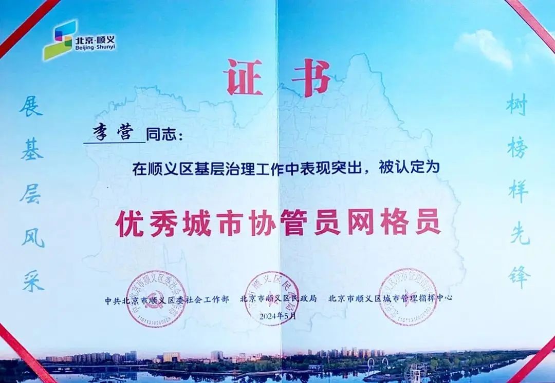 今年,李营被评为“顺义区优秀城市协管员网格员”。