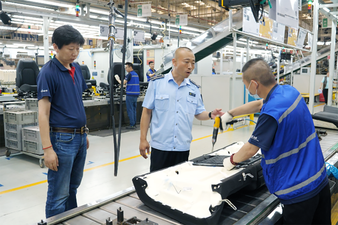 李营(中)在北京李尔现代坦迪斯汽车系统有限公司进行安全检查。
