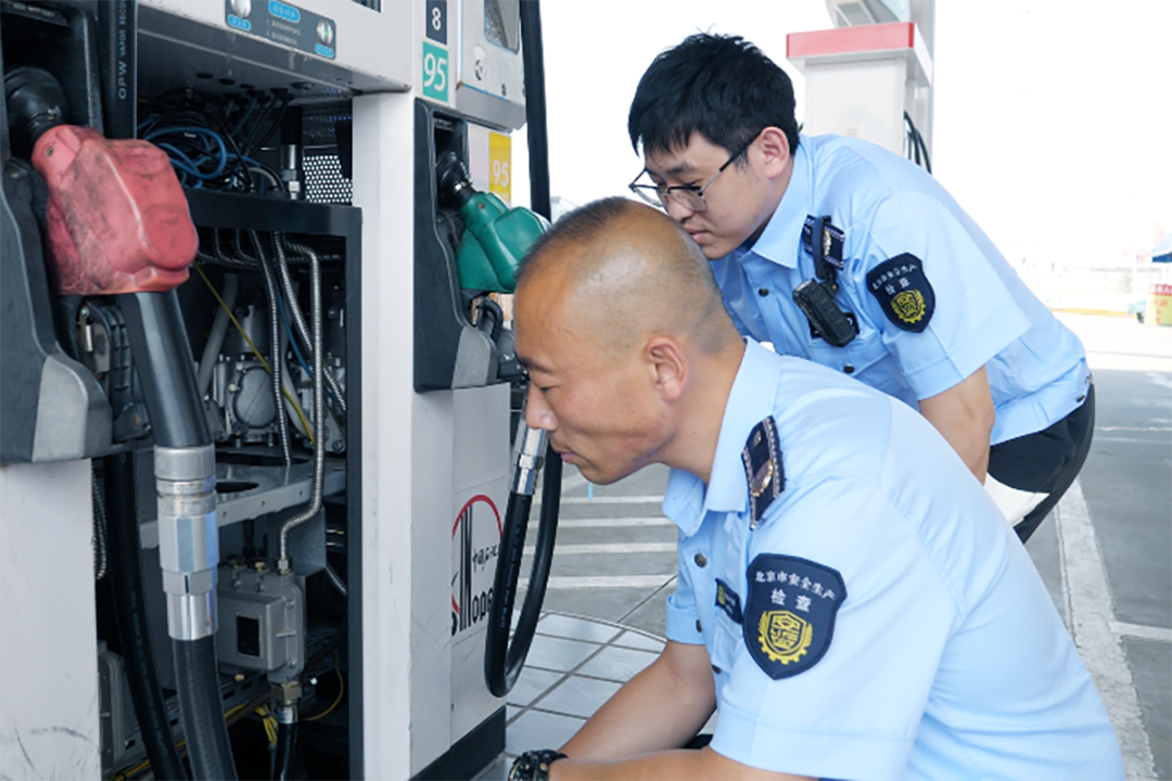 李营(左)检查辖区加油站的加油机运行情况。