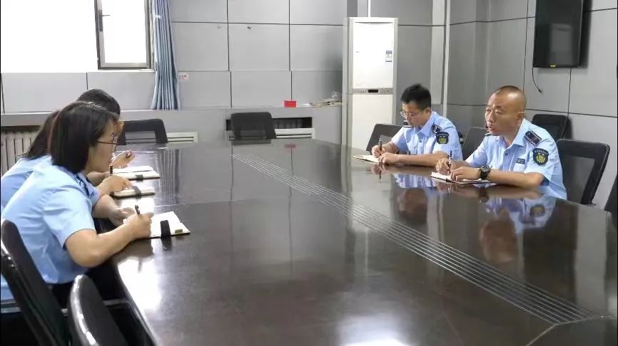 李营(右一)与队员讨论辖区安全生产检查重点。