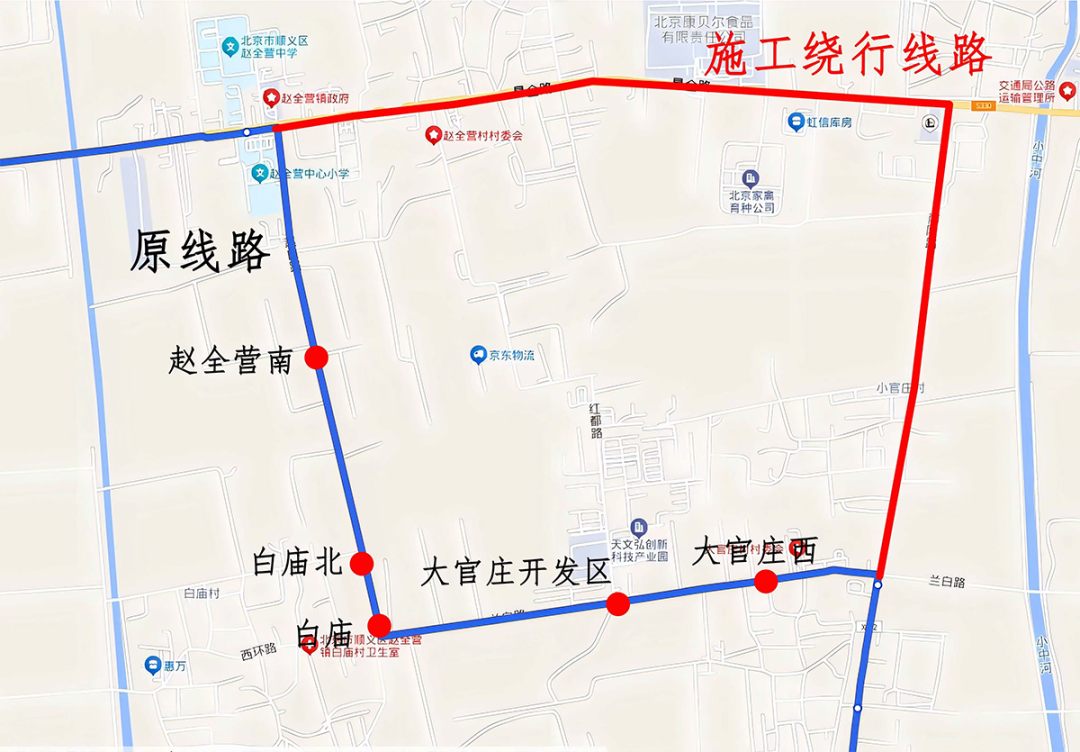 因赵白路、兰白路正在断路施工,顺30路由原线路兰白路—赵白路临时调整至南陈路—昌金路,取消赵全营南、白庙北、白庙、大官庄开发区、大官庄西5站。