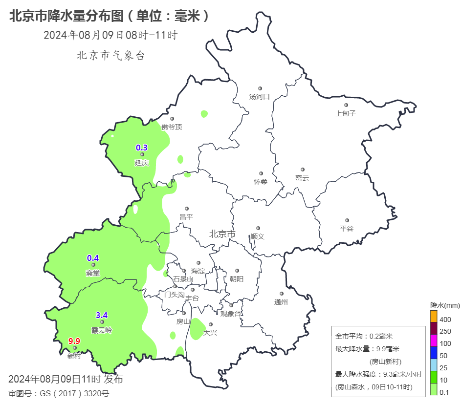 目前降水主要在我市西部地区。9日08时至11时,全市平均降水0.2毫米;最大降水出现在房山新村9.9毫米。最近一小时最大降水量为房山森水9.3毫米。