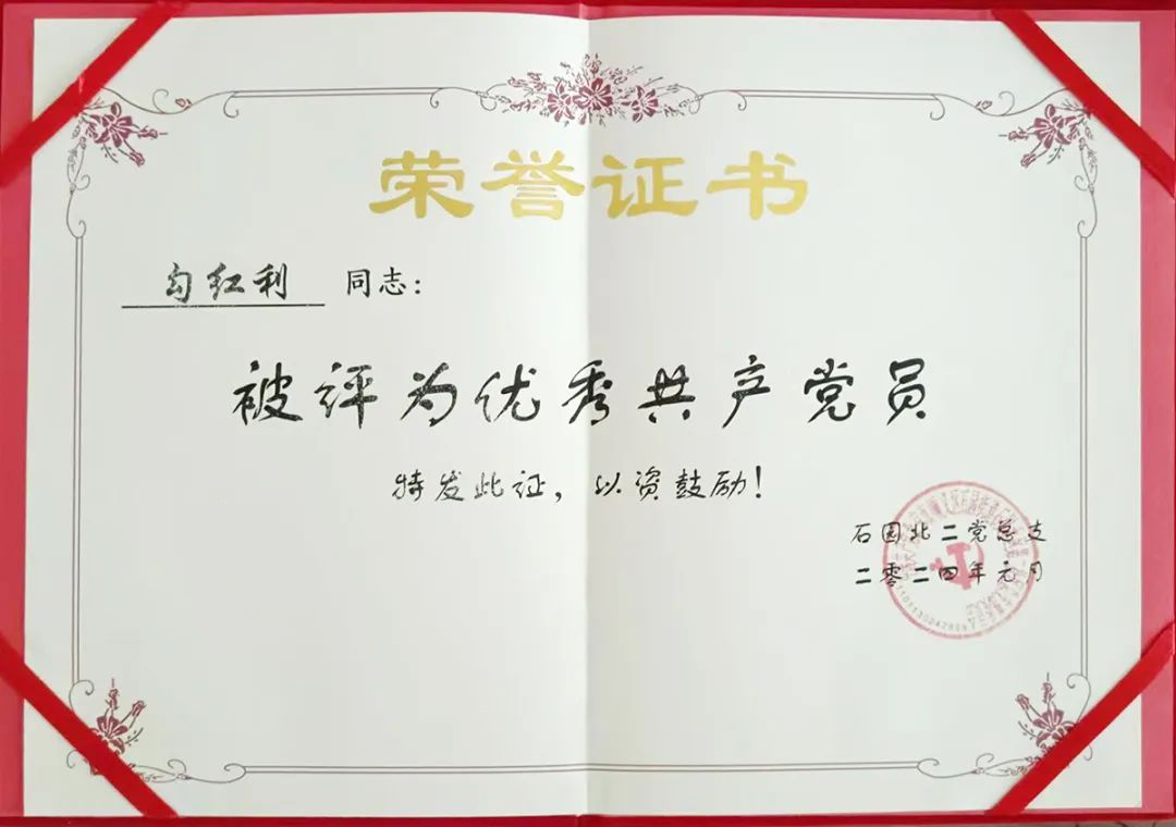 今年1月,勾红利被石园街道石园北二社区党总支评为优秀共产党员。