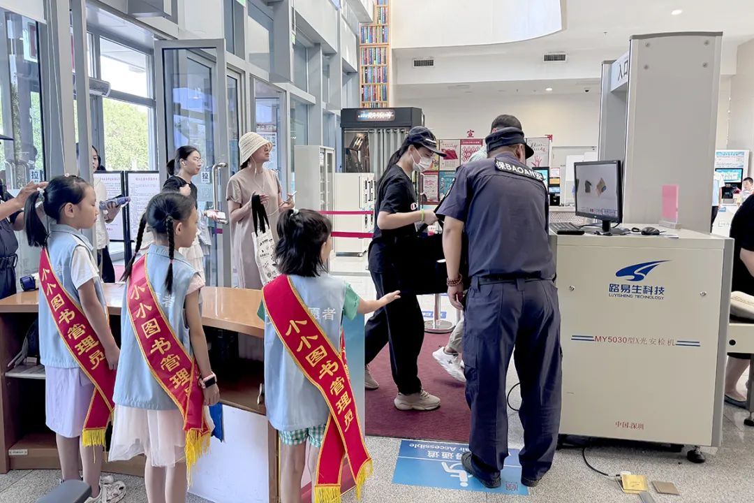 小小图书管理员细心提醒带包读者过安检。