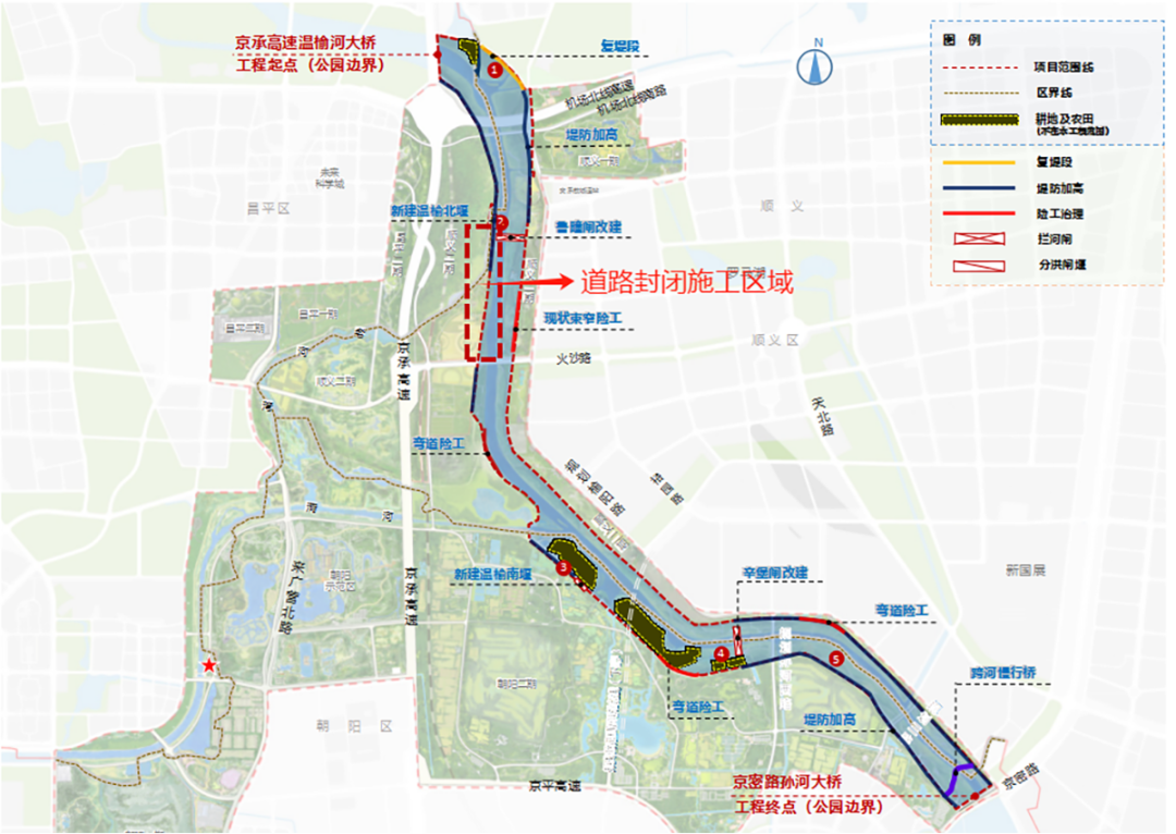 本工程计划于8月21日起对温榆河右岸(京承高速温榆河大桥至火沙路路口)路段进行封闭施工,具体封闭断路点位及导行路线情况如下: