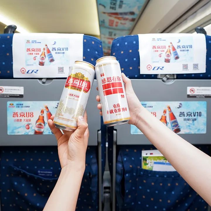 在燕京啤酒高铁专列的车厢里,从座椅头枕、桌板到行李架,均设有燕京啤酒标志和产品的精美设计,不少乘客饶有兴致地与燕京啤酒专列合影。“非常幸运乘坐燕京啤酒专列,车厢里氛围非常浓,很适合拍照打卡,旅途的心情都愉悦了不少。”乘客张女士说。