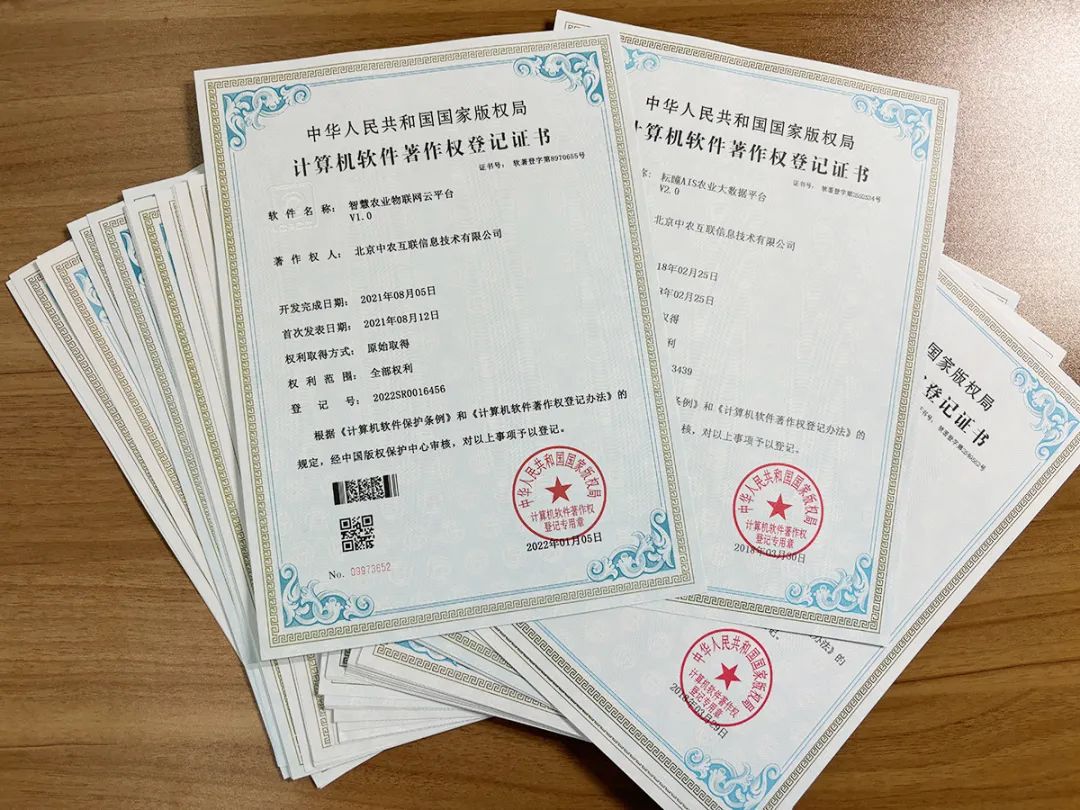中农互联目前拥有专利、软件著作权等各类知识产权102项,行业认证10余项。