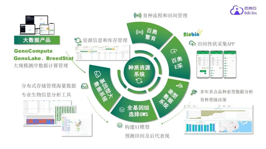 百奥云智能育种平台以育种数据的采集、管理和智能分析为主线,包括百奥e采、育种表型数据系统、基因型大数据系统、种质资源管理系统、基因组/多组学数据库和全基因组选择预测(GWS)平台等软硬件产品,形成了从数据采集、信息管理到智能分析的完整平台。目前,百奥云智能育种平台系列产品已获得16项软件著作权、4项发明专利。