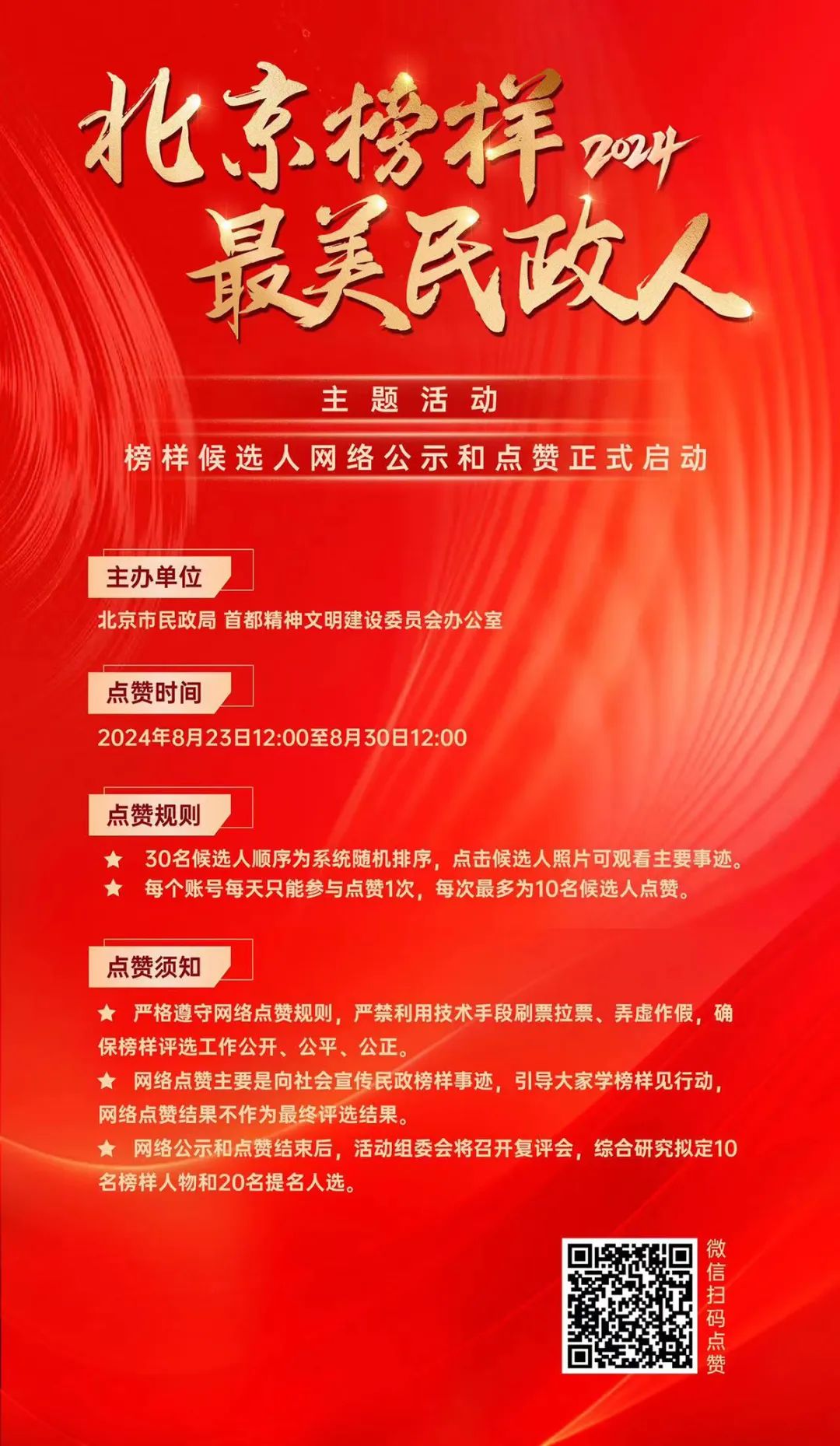 微信扫描下方二维码,进入2024“北京榜样·最美民政人”主题活动网络公示和点赞平台,即可为候选人点赞。