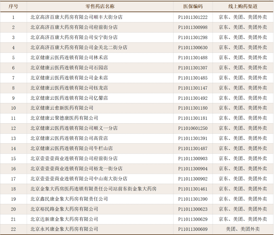 目前,北京市参保人员可在全市400余家医保定点零售药店线上使用医保个人账户购买非处方(OTC)药品。定点零售药店范围覆盖全市16个行政区和经济开发区,药店数量持续增加,药店名称实时更新。