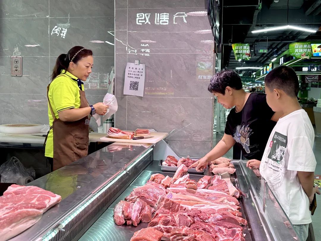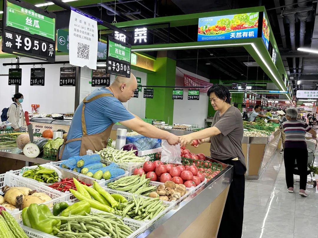 蔬菜区位于市集的中心区域,辣椒、青菜、西红柿等各类蔬菜新鲜充足,吸引了不少市民挑选购买。“我们的种植基地就在高丽营镇,采取源头直采模式,减少中间环节,为市民提供新鲜、绿色、健康的蔬菜。”商户单合军介绍。