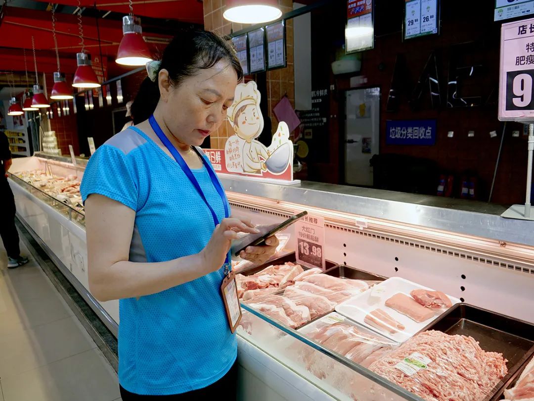 无论是水果、蔬菜、肉类,还是调味品、生活用品,它们的摆放位置对于桂英来说都是了如指掌。她一边仔细查看商品价签,一边比对上次价格,将数据及时录入到CPI手持采价器中。
