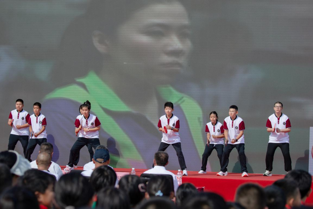 初一年级学生代表们带着对体育精神的敬仰与传承,用乒乓动作传递运动的魅力,在轻快的音乐中展现了青春的活力与激情。