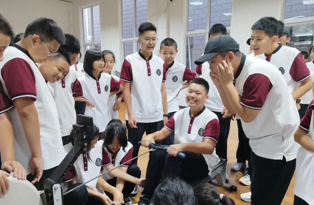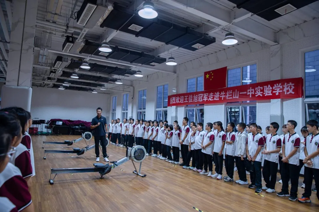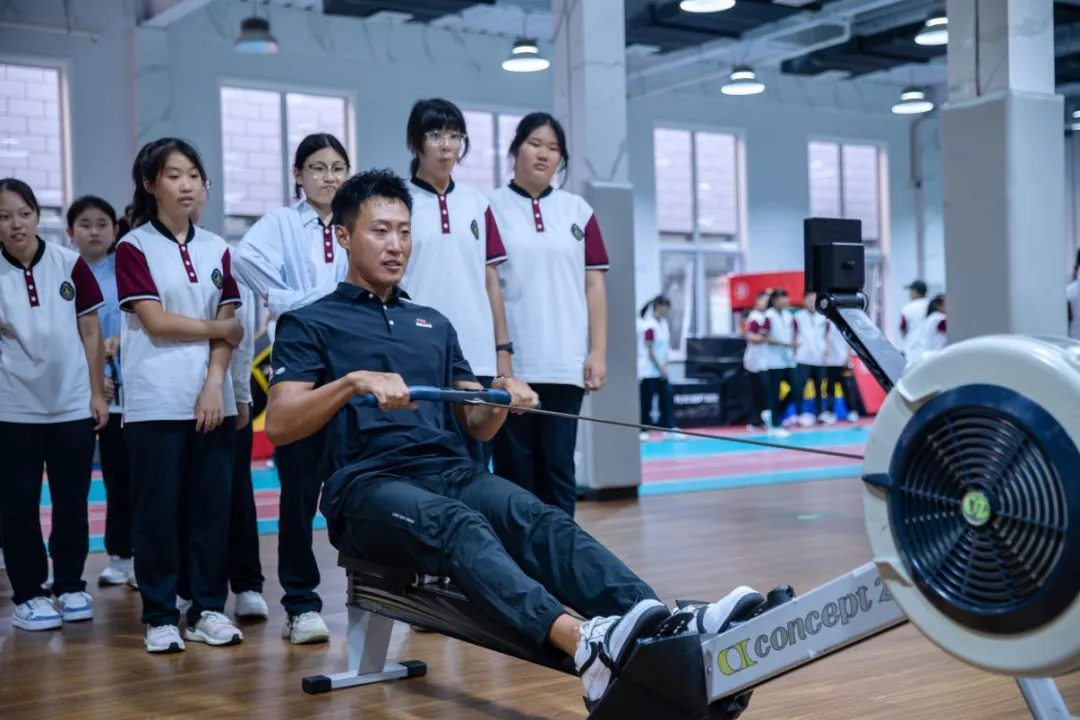 三届中国陆上赛艇冠军王佳旭携其团队也与学生们开展了一场别开生面的互动活动。王佳旭亲自示范划船器使用技巧,并引导学生们亲身体验,耐心纠正动作,传授专业知识。随后的1100米划船接力赛更是将现场气氛推向高潮,初一3班的学生们最终夺得桂冠。活动中,学生们深切感受到运动员的刻苦训练与拼搏精神,纷纷表示要以冠军为榜样,在学习生活中同样勇于挑战、坚持不懈。此次活动不仅让学生们享受到了运动的乐趣,更激发了他们追求卓越、永不言弃的斗志。