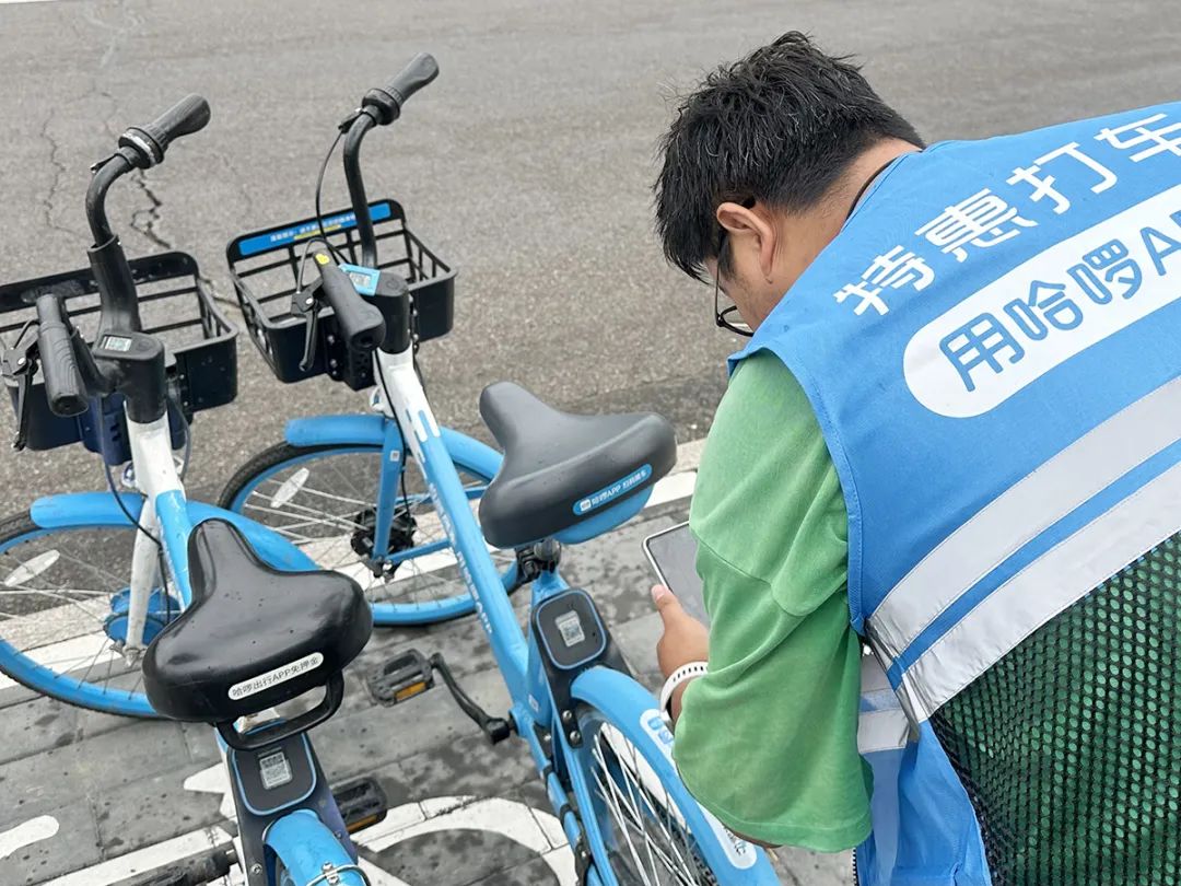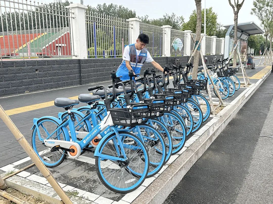 在顺义九中旁的共享单车停放区,两名工作人员正在整理车辆,并通过扫码的方式检查车辆使用情况,确保群众借还车顺利。区交通局加强对全区校园周边54处共享单车停放区的巡查力度,让校园周边的环境更加整洁有序,为师生们提供良好的出行体验。