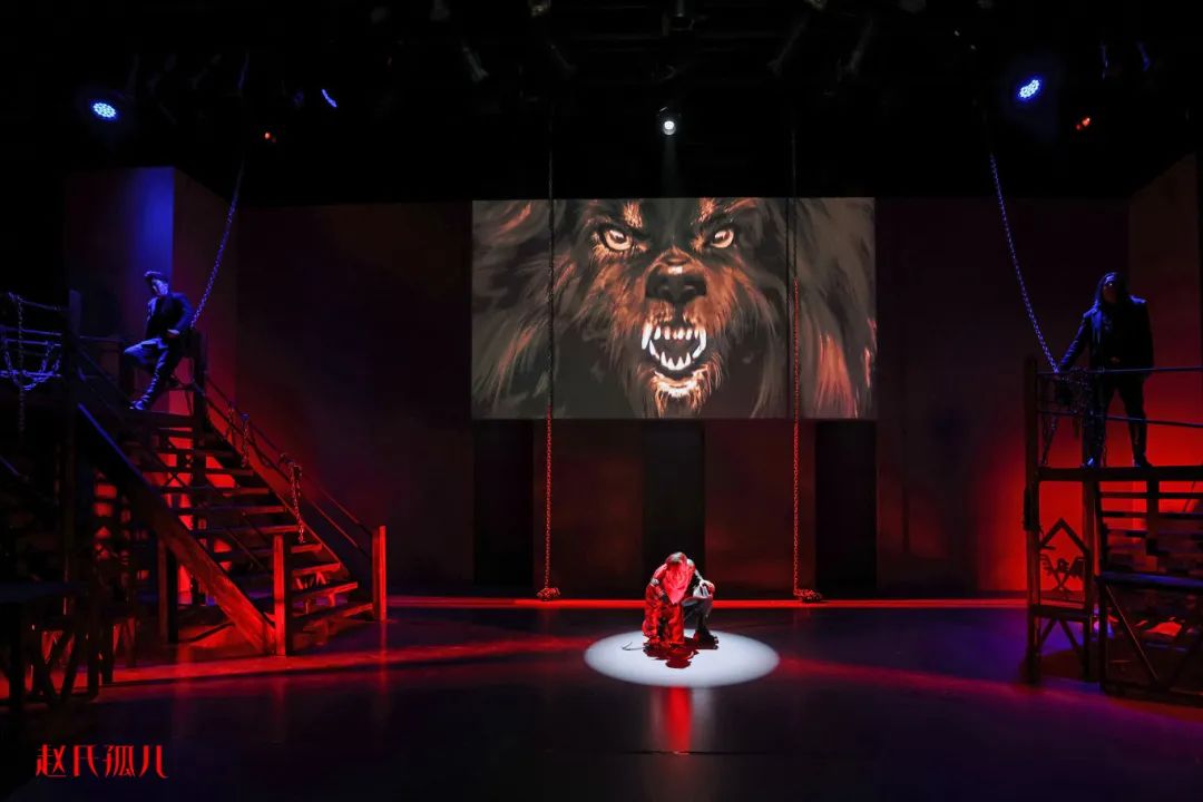 金属质感的舞台装置、桥型的高台、LED背景屏幕、现代的服装,在一个充满现代元素的舞台上,《赵氏孤儿》突破了小剧场的限制,用舞台想象构建起了自由的戏剧空间。贯穿其中的音乐和现场演唱,既代表了剧中人物的心声,也与当下的观众进行了对话。这些艺术化的处理,与作品的讲述方式相辅相成。让观众在沉浸与跳出间自由切换。