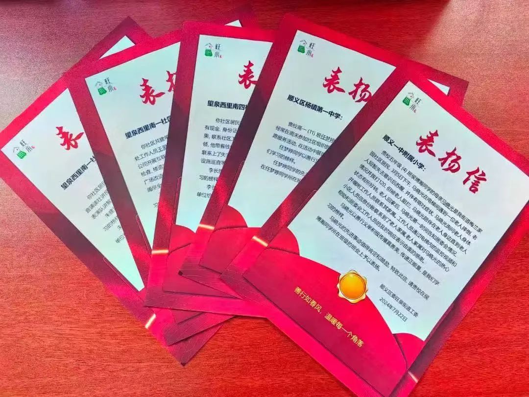 去年以来,顺义区探索“顺义好风气”新机制,通过发掘褒奖基层好人好事、给受表扬的人戴红花授荣誉、利用融媒体等平台开设专栏宣传、向好人好事所在单位以及子女所在单位或学校寄送“表扬信”等措施,表彰百姓身边的榜样模范。目前,顺义区总计发掘好人好事2400件,寄送表扬信636封。