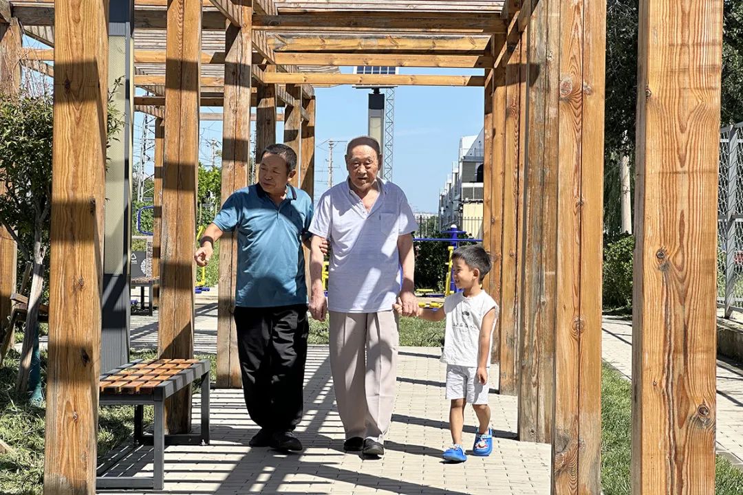 潘德清陪伴岳父和孙子在楼下遛弯儿。