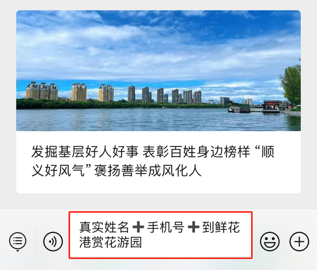 您发送“真实姓名+手机号+到鲜花港赏花游园”至“北京顺义”微信公众号,即可参与抢票。