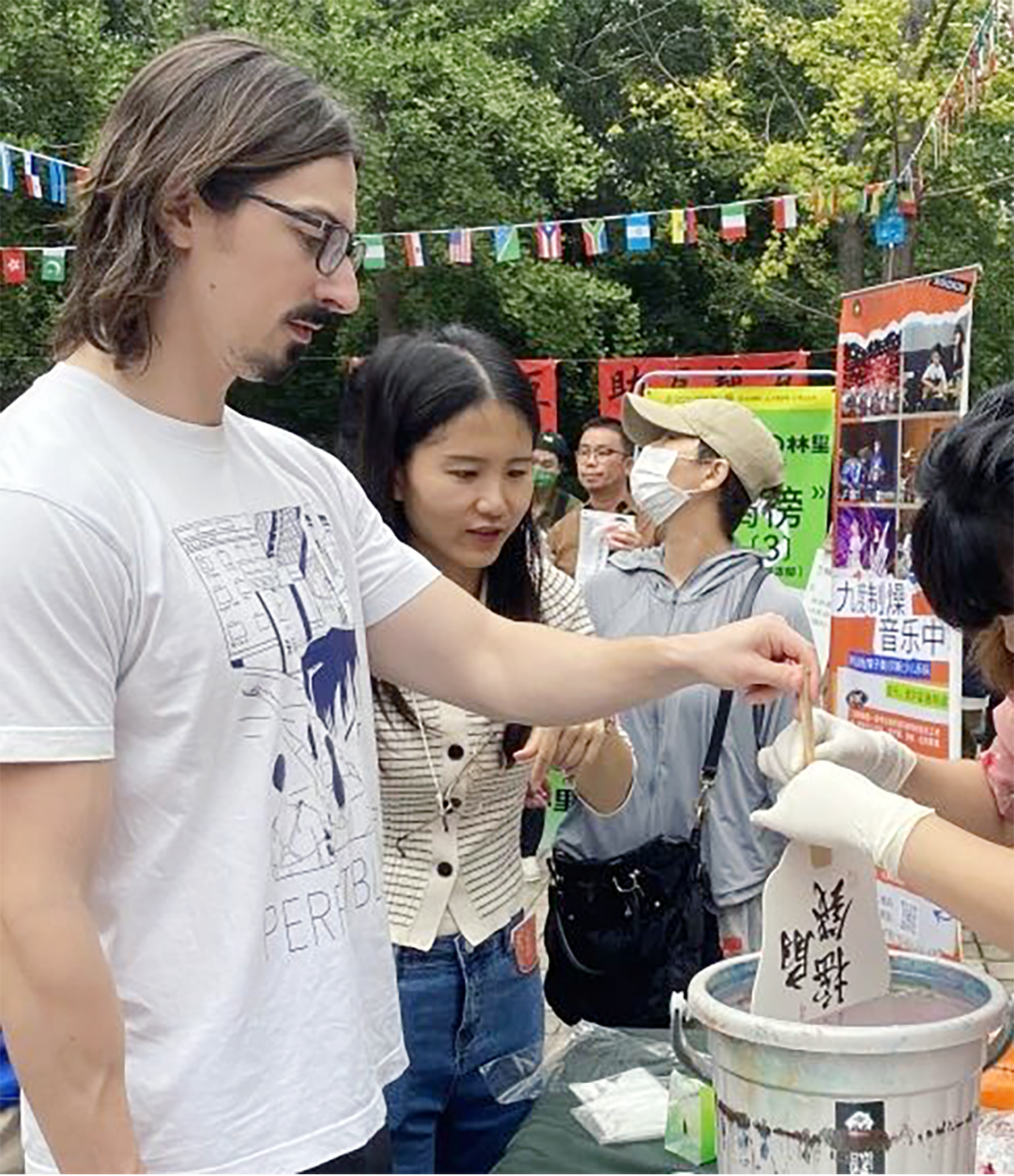 活动现场,非遗手工制作展示区深受中外居民的喜欢,大家踊跃体验,感受中国非遗的独特魅力。剪纸艺人用灵巧的双手剪出各种精美的图案,书法爱好者们写下一幅幅寓意美好的作品,漆扇以细腻的纹理、绚丽的色彩展现无尽魅力……现场充满艺术气息。