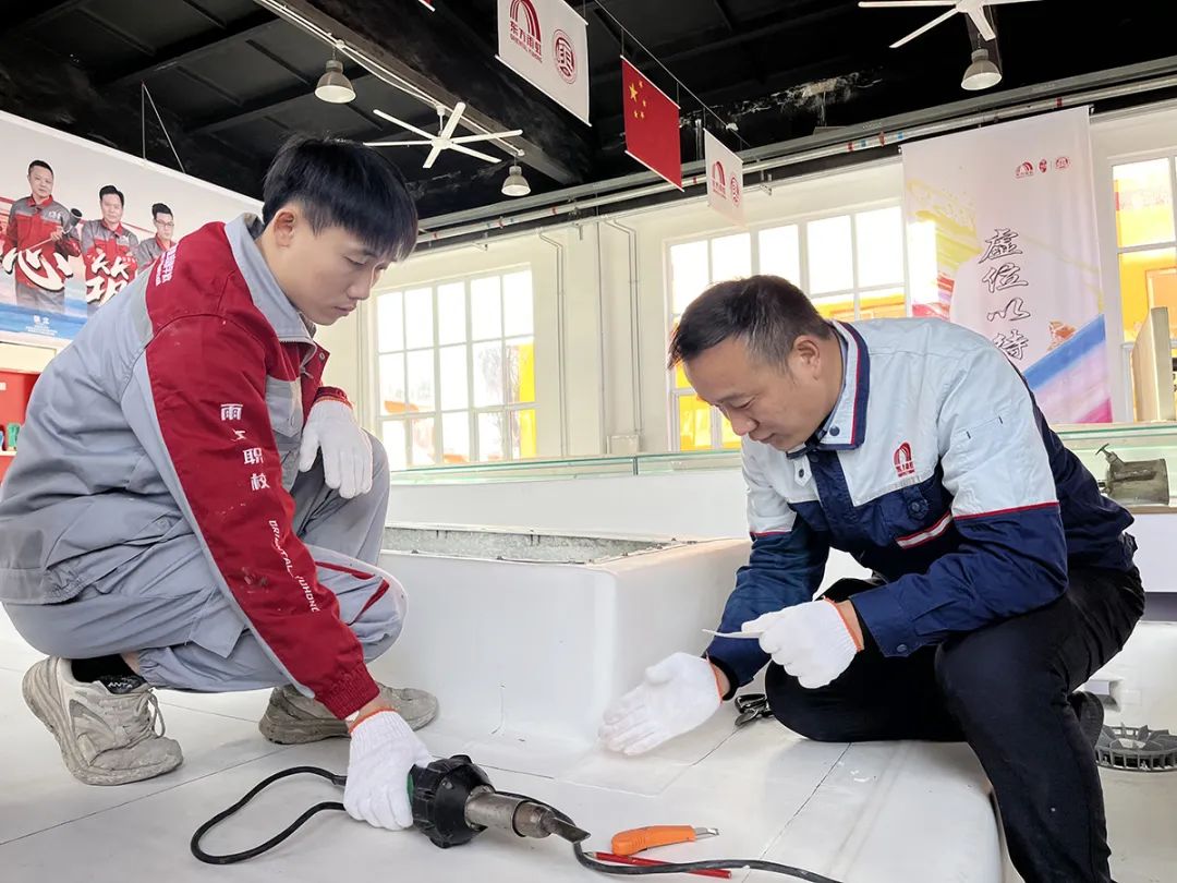 张广辉(右)讲解屋顶防水材料焊接注意事项。