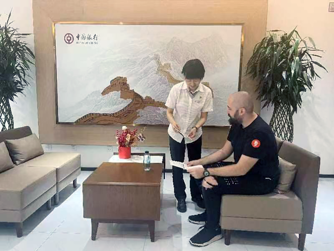 来华人士在中国银行顺义天竺支行工作人员陪同下办理业务。