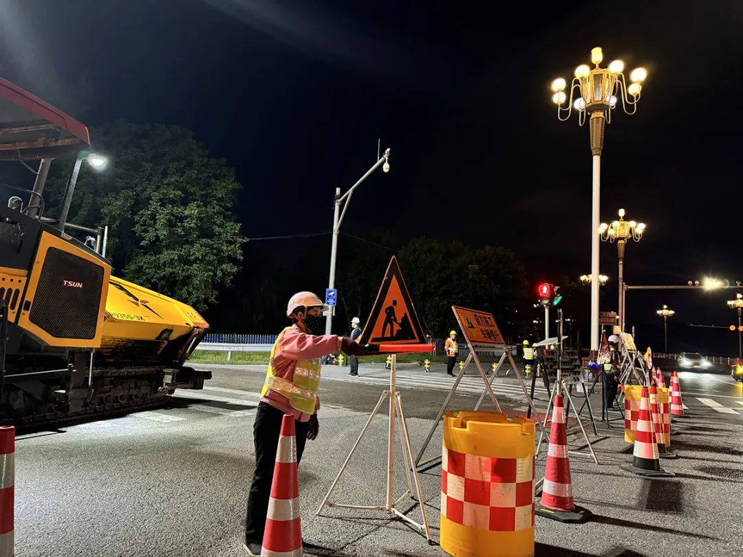 22时,外环路路段的小修作业正如火如荼地进行。现场施工人员严格按照规范布设作业区,控制施工范围,确保施工安全。养护工人相互分工、默契配合,有条不紊地进行铣刨、清理坑槽、撒布喷油、摊铺压实等作业。