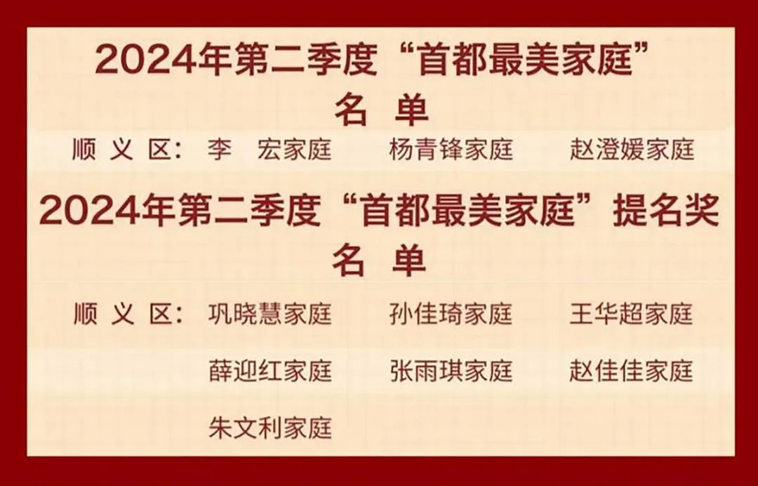 2024年第二季度“首都最美家庭”顺义区获奖名单。